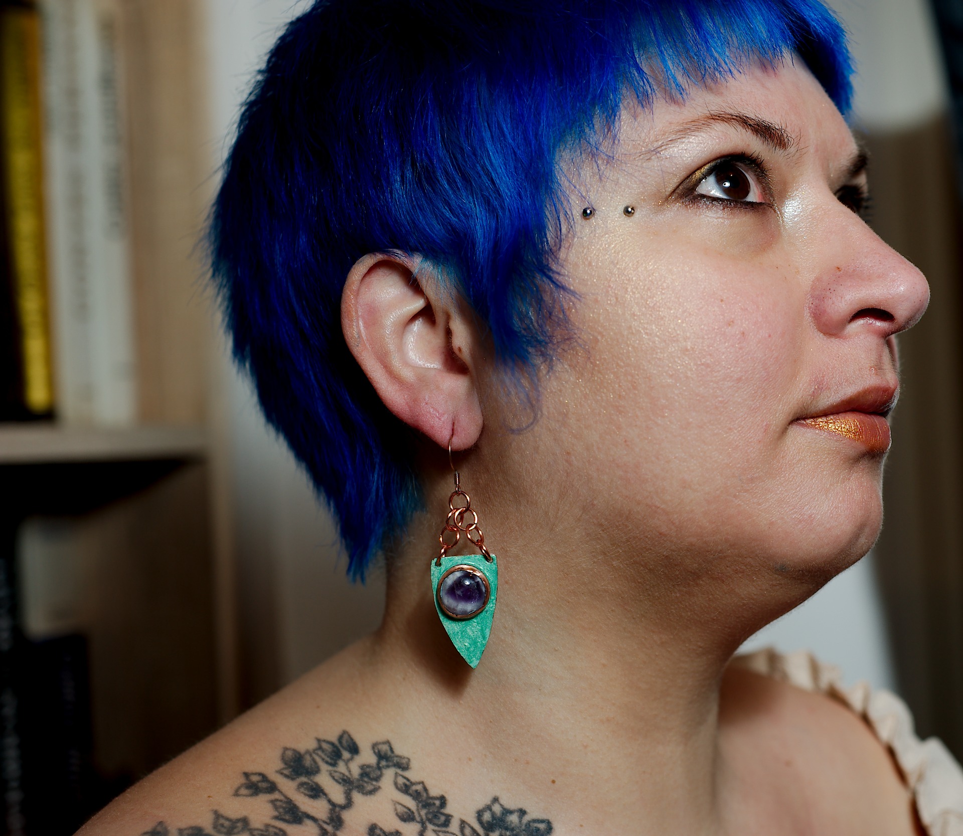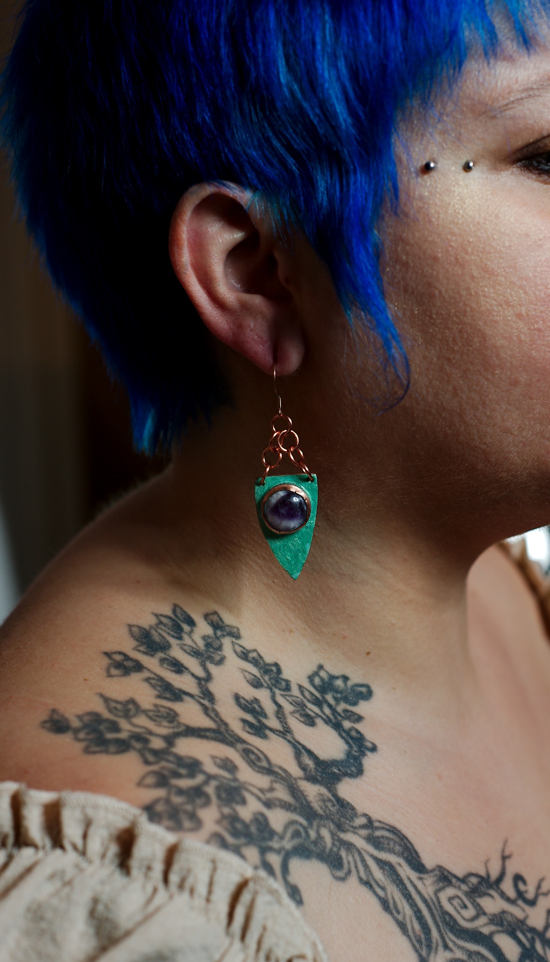 Entièrement réalisées à la main, ces boucles d'oreilles en cuivre émaillé à froid dévoilent une teinte profonde, presque vivante, qui change au fil de la lumière. Au centre, une améthyste chevron sertie selon une technique traditionnelle déploie ses nuances violettes, comme une pierre trouvée au détour d'un sentier secret.
