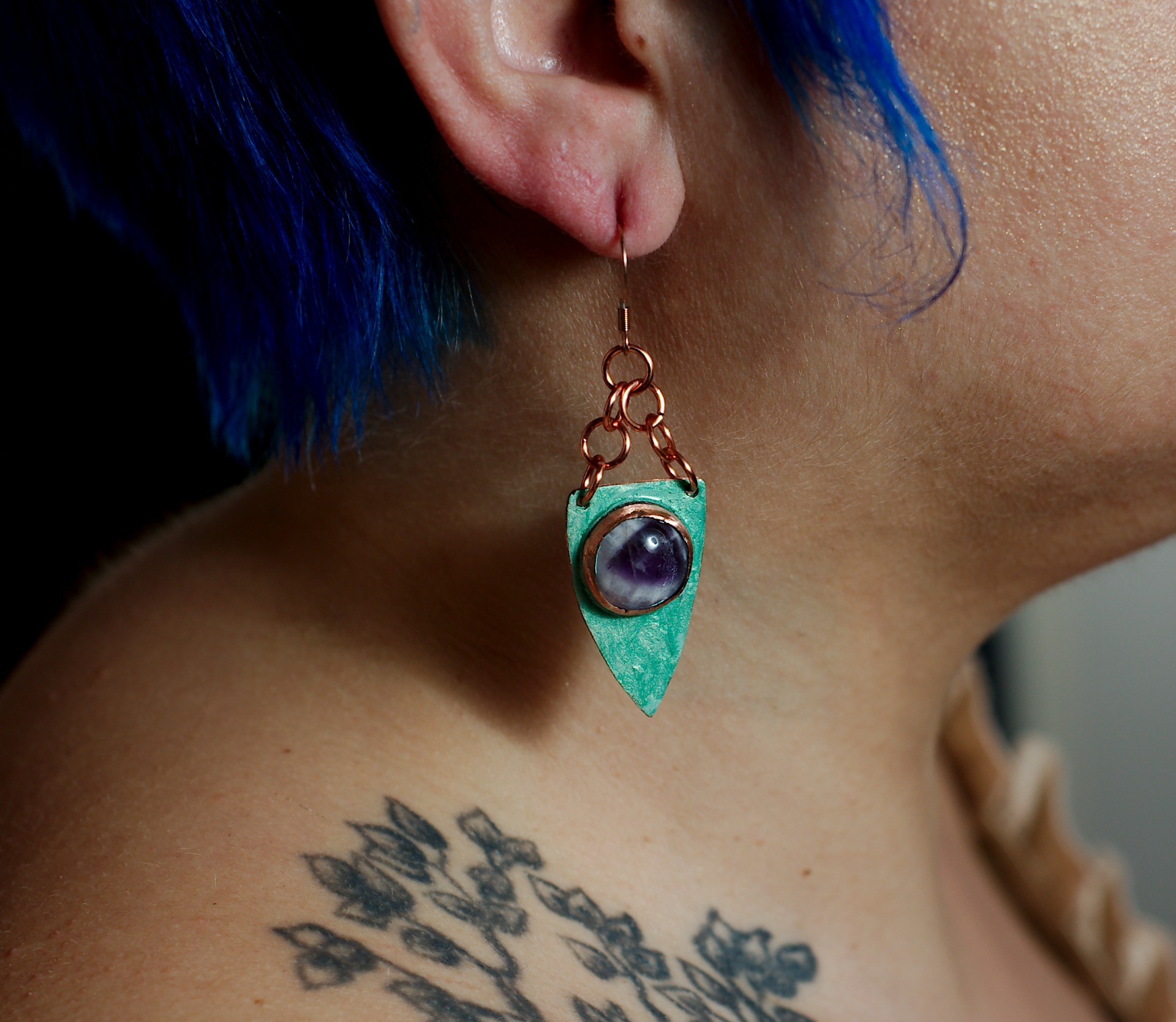 Entirely handcrafted, these earrings are forged in copper and cold-enameled, revealing a deep, living color that shifts with the light. At their center rests a chevron amethyst, traditionally set, its violet bands unfolding like a stone discovered along a hidden path.