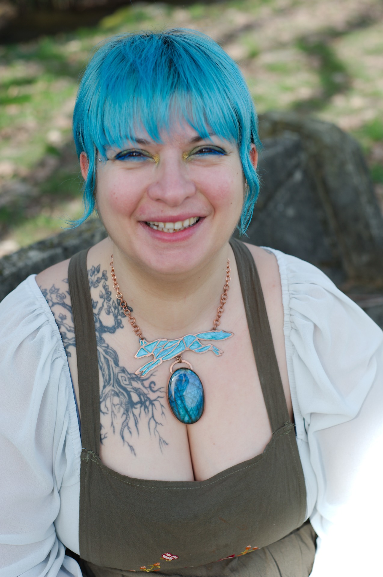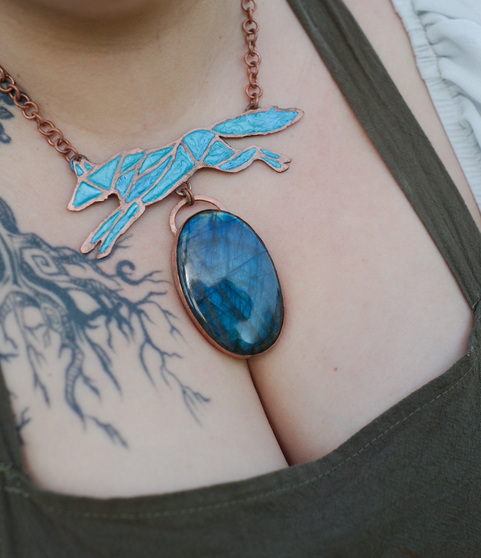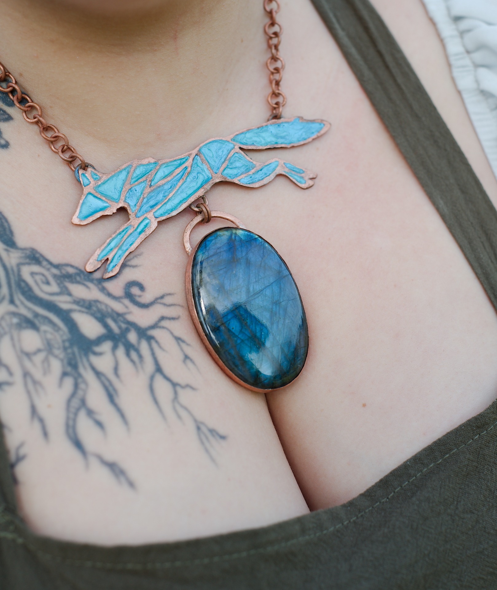 Son pelage stylisé, paré d'émaux à froid dans des tons bleus profonds, évoque la lumière froide de la nuit et les reflets de la neige sous les étoiles. Suspendue sous sa course, une labradorite bleue d'une intensité rare capte la lumière comme une eau sombre enchantée — pierre des voyageurs, des rêveurs et des gardiens des seuils invisibles.