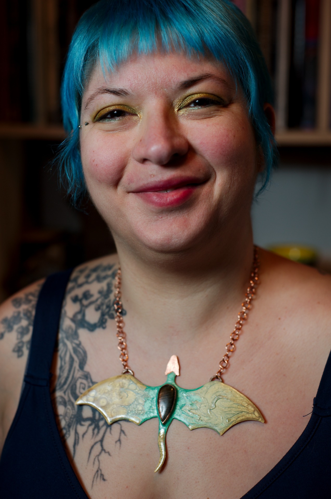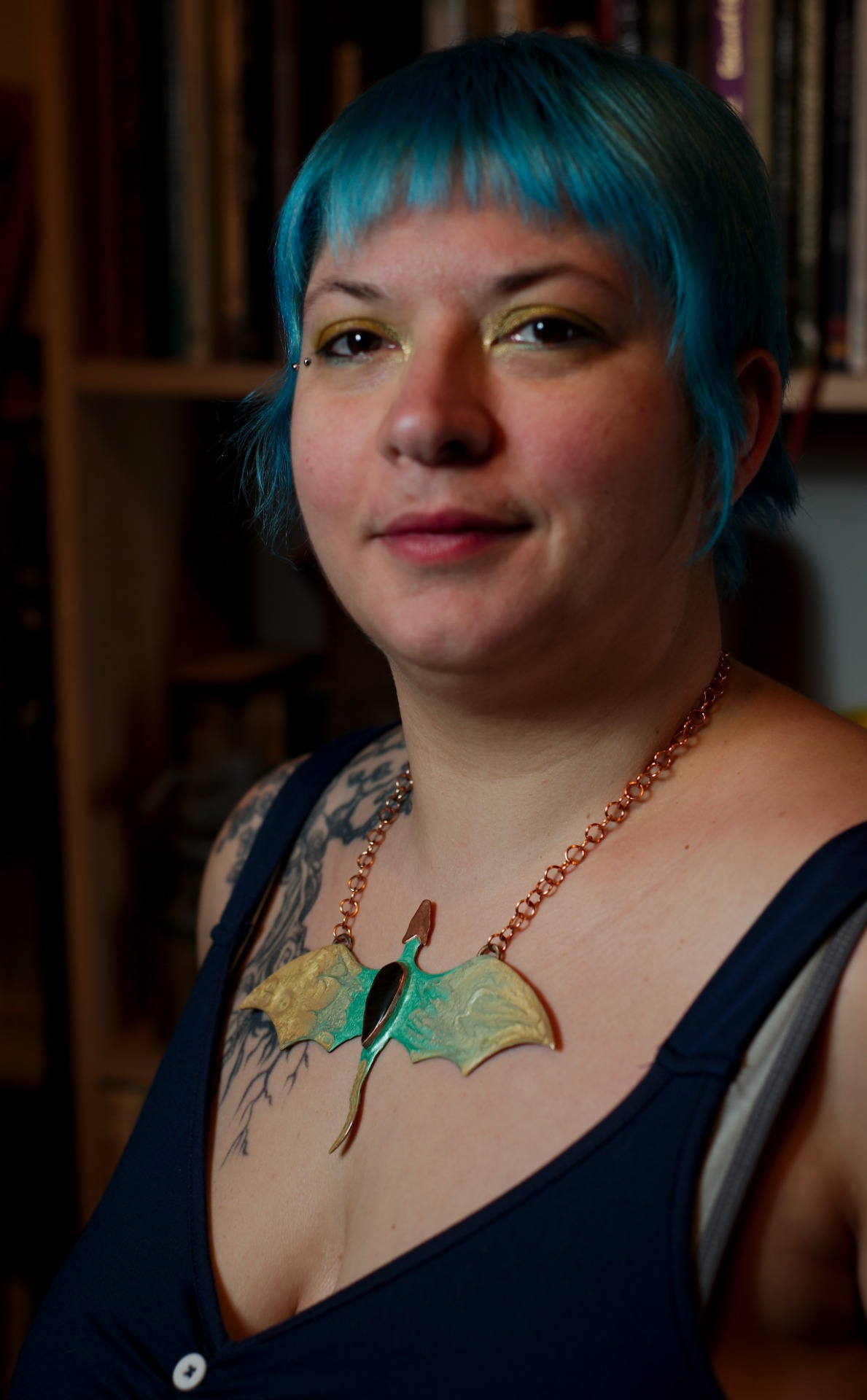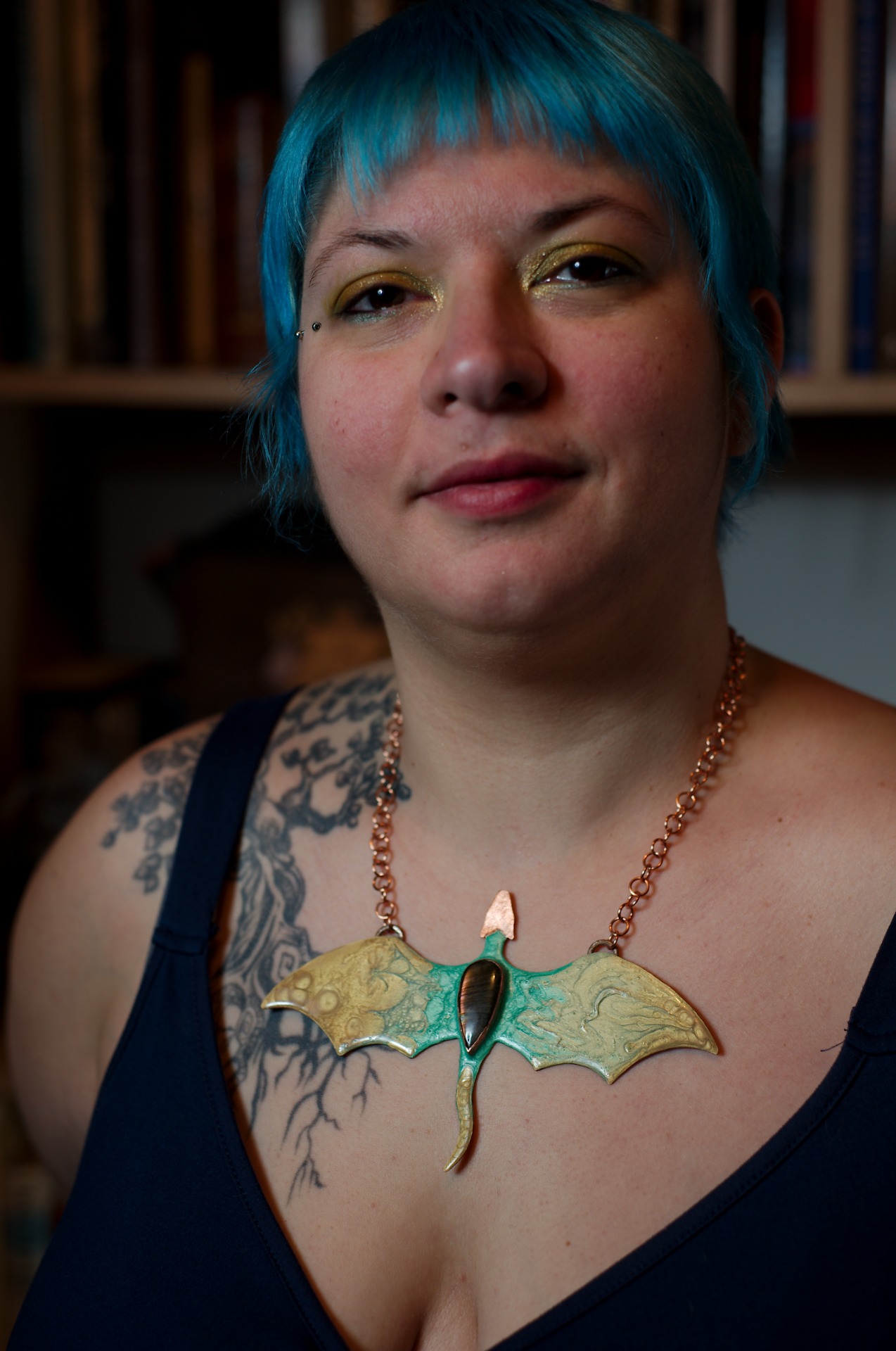 Avec ses 16 cm d'envergure, il déploie une silhouette évoquant des ailes déployées, à la fois protectrices et majestueuses. Le cuivre patiné, sublimé par un émaillage à froid, révèle des nuances profondes mêlant or ancien et vert mystique, comme si le métal avait traversé les âges.