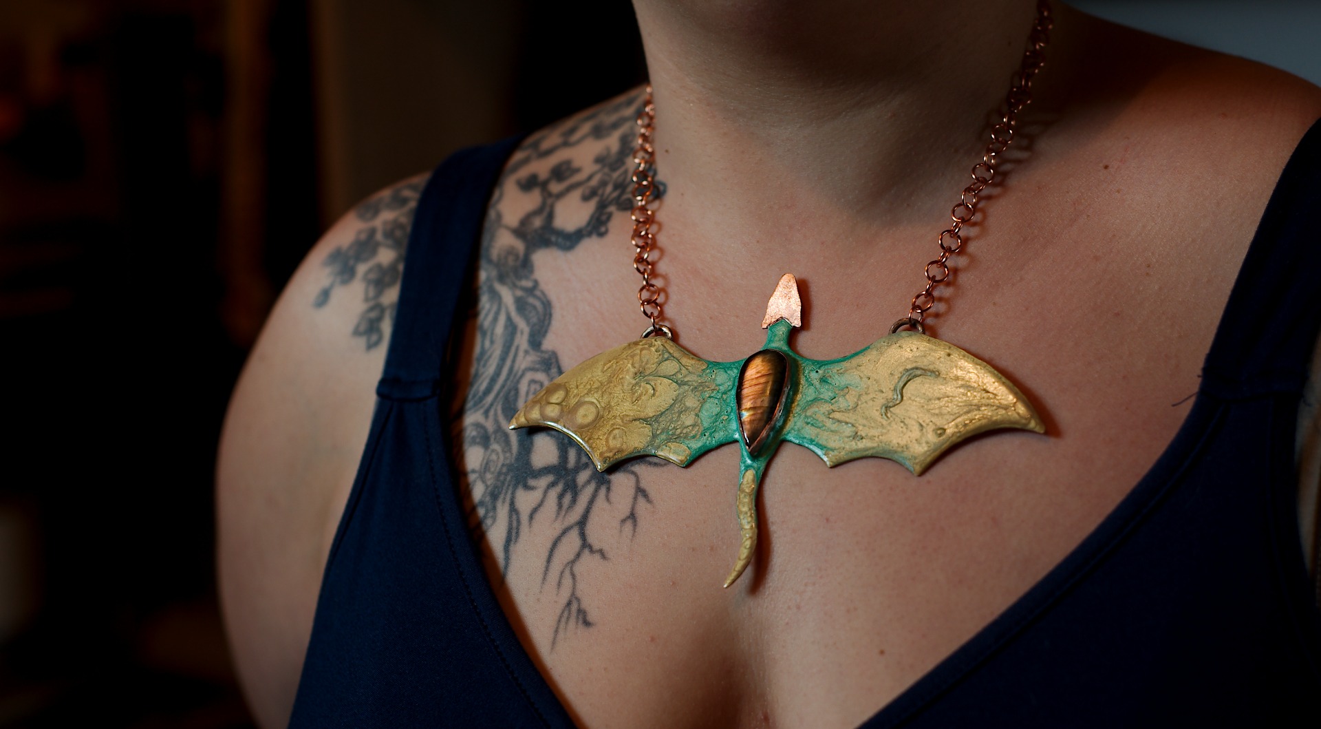 With a span of 16 cm, it unfolds into a silhouette reminiscent of outstretched wings — both protective and majestic. The patinated copper, enhanced by cold enameling, reveals deep hues blending antique gold and mystical green, as if the metal itself had journeyed through ages.